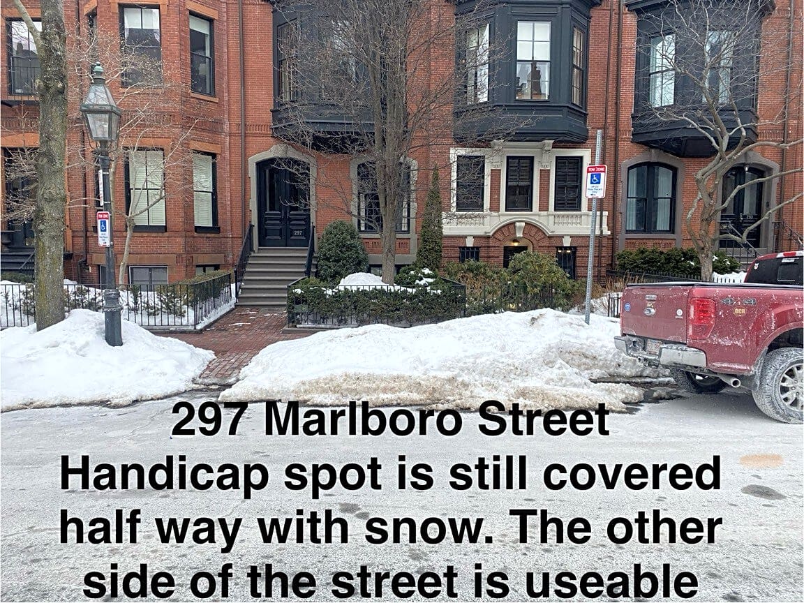 297 Marlborough St, Boston, Ma, 02116As reported last week another handicap spot @ 297 Marlboro street is also halfway covered with snow and not usable for handicap people in the neighborhood same as it was last Monday when I reported it. Last week 3 of the 4 handicap spot were unavailable for use. This week it’s 2 of 4.