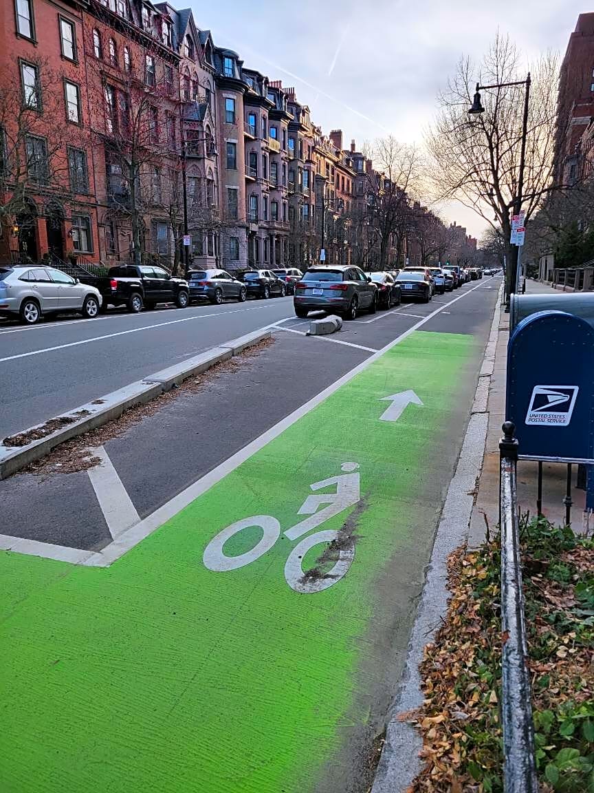 Intersection Of Berkeley St And Beacon St, Boston, MaConcrete block knocked over in parking lane on Beacon bike lane near Berkeley St