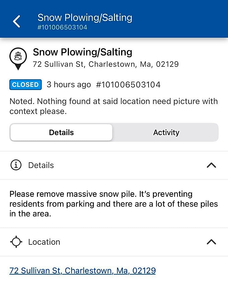 72 Sullivan St, Charlestown, Ma, 02129It’s got an address and description. You don’t need a photo in this case. If you go there, you’ll see the snow pile which needs to be removed because it’s taking up resident parking. Come on!