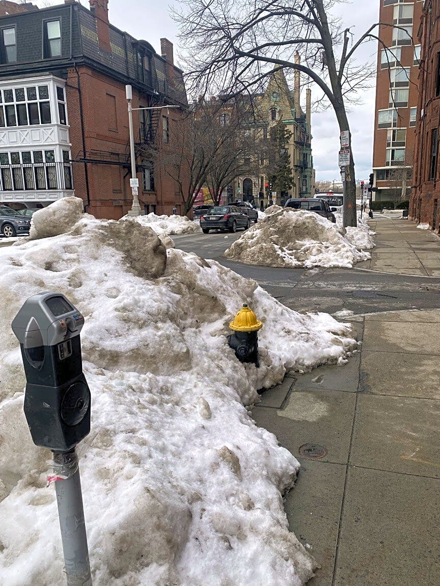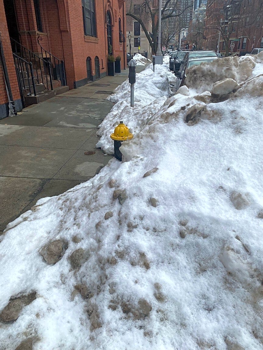 Intersection Of Public Alley No. 416 And Public Alley No. 417 And Fairfield St, Boston, MaFire hydrant blocked by giant snow pile. Truck would have difficulty hooking up to hydrant if an emergency happens in the area. Crews could also crew the handicap spot 4 spots away I have asked about two weeks in a row at the same time. ? On Fairfield street. But I noticed this hydrant not being able to get to when I couldn’t use the handicap spot 2 weeks after the big storm! Which is missing a sign too after the pole was replaced mid storm. As I reported yesterday and last Monday. This hydrant is across from 1 FAIRFIELD STREET on the corner of the SOUTH West corner of Public Alley 417.