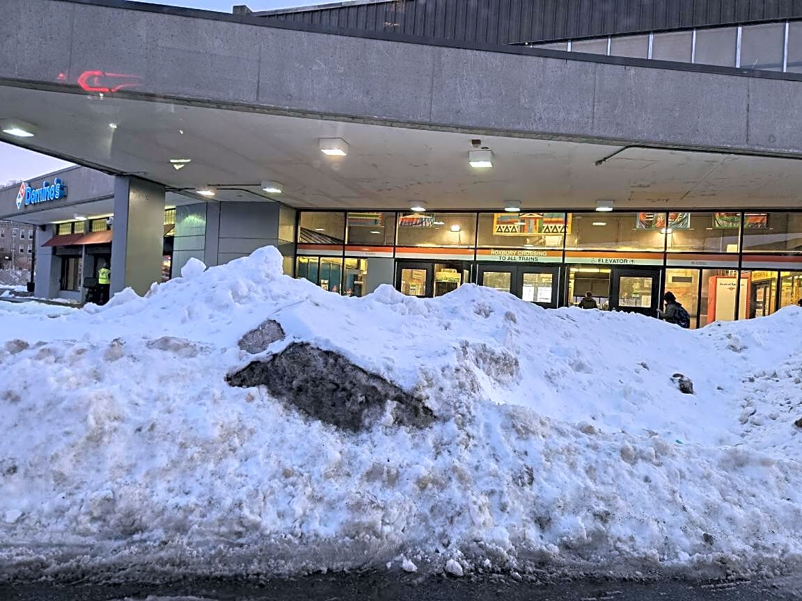 1400 Tremont St, Mission Hill, Ma, 02120Massive snow pile in front of Roxbury Crossing Station making it challenging for people to access the station from the street.