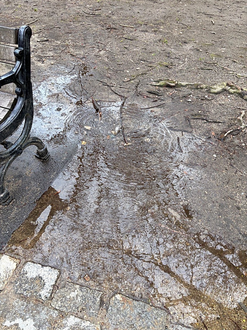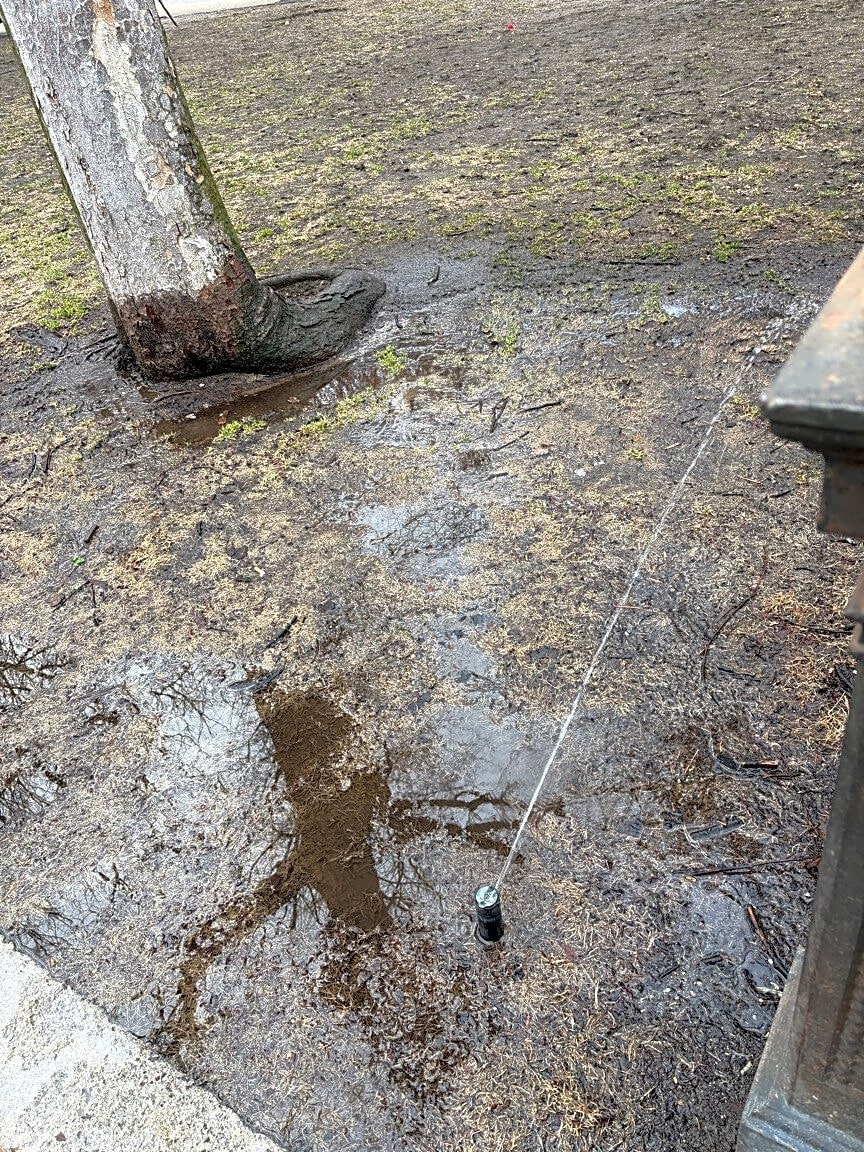 Commonwealth Ave & Exeter StIrrigation system on. At Exeter and Comm south corner, and further west into mall. Not sure if intentional?