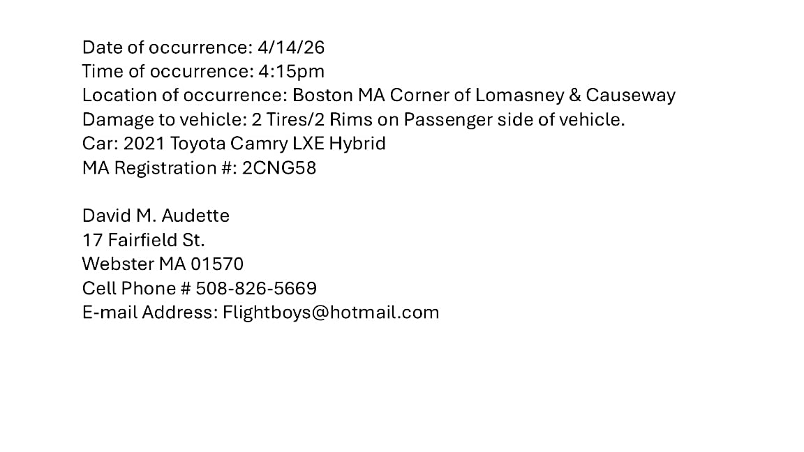 Intersection Of Causeway St And Lomasney Way And Merrimac St And Staniford St, Boston, MaDate of occurrence: 4/14/26 Time of occurrence: 4:15pm Location of occurrence: Boston MA Corner of Lomasney & Causeway Damage to vehicle: 2 Tires/2 Rims on Passenger side of vehicle. Car: 2021 Toyota Camry LXE Hybrid MA Registration #: 2CNG58 David M. Audette 17 Fairfield St. Webster MA 01570 Cell Phone # 508-826-5669 E-mail Address: Flightboys@hotmail.com Wo do I contact to get reimbursed for the damage.
