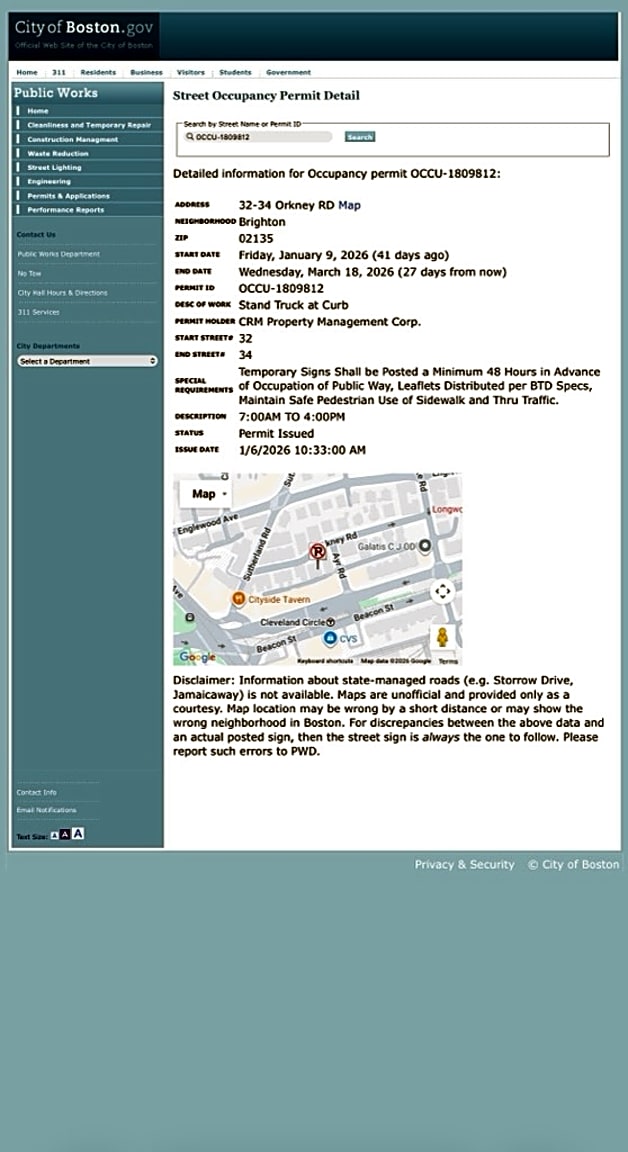 32 Orkney Rd, Brighton, Ma, 02135Type of Work: [Unknown] Name of Contractor/Utility working: [Unknown] If posted on poles, What is the TMP# on the posting: [OCCU-1809812] Please specify details.: [Constituent reports contractors are taking up more parking than what is allowed within the terms of their street occupancy permit on a street that is designated resident only parking, as well as being rude to residents on that street about it.]
