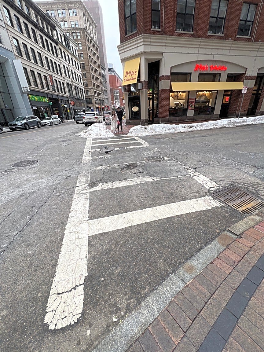 Intersection Of Bigelow St And Brooks St, Brighton, MaPlease fix the crosswalk at this intersection. It is entirely gone on one side and the other side is almost completely faded or covered by snow and cars. The sign was also removed months ago by a construction crew and never replaced. Drivers cannot see this crosswalk and do not slow down, so it is a huge danger for pedestrians. |