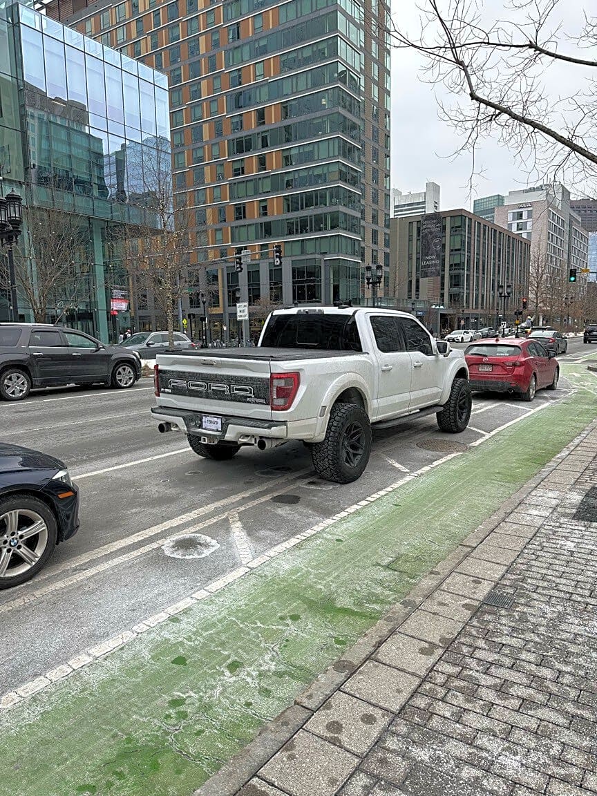 Intersection Of Seaport Blvd And Northern Ave, Boston, MaIllegal parking. Restricted zone. Daylighting; bike lane.