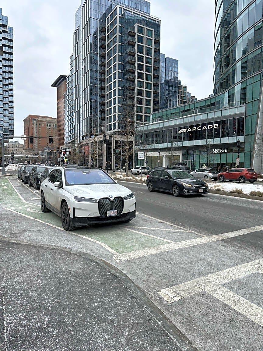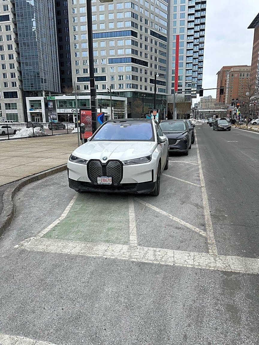 Intersection Of Boston Wharf Rd And Seaport Blvd, Boston, MaIllegal parking. In restricted zone. Risks dooring.