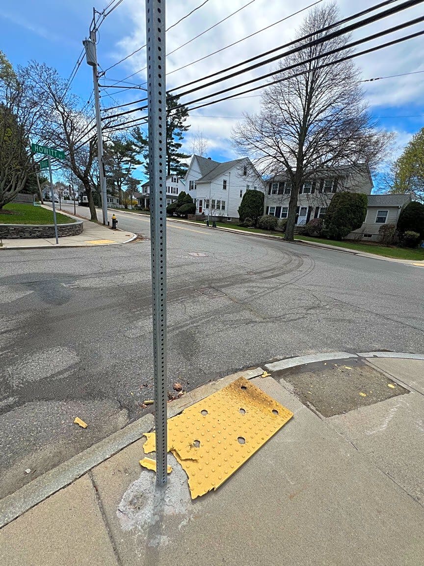Intersection Of Howitt Rd And Lagrange St, West Roxbury, MaThe yellow tactile paver at Lagrange St and Howitt Rd was torn off this winter