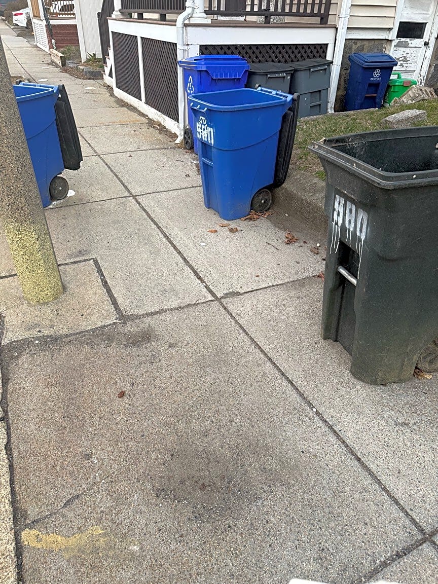 580 Ashmont St, Dorchester, Ma, 02122Trash barrels blocking side walk