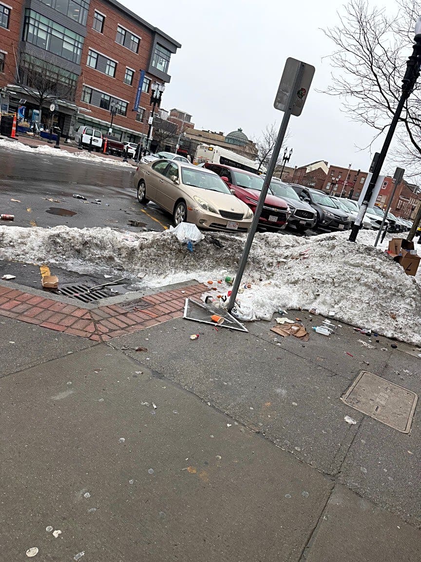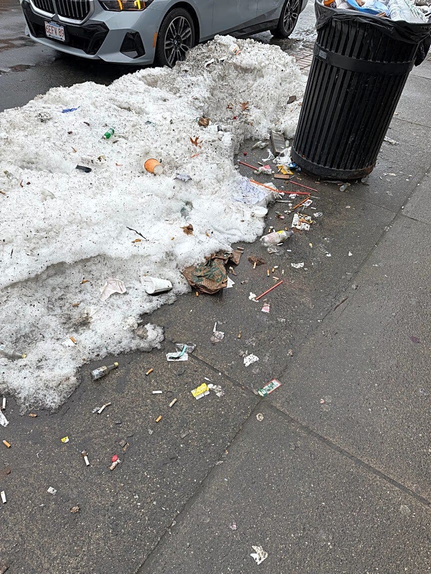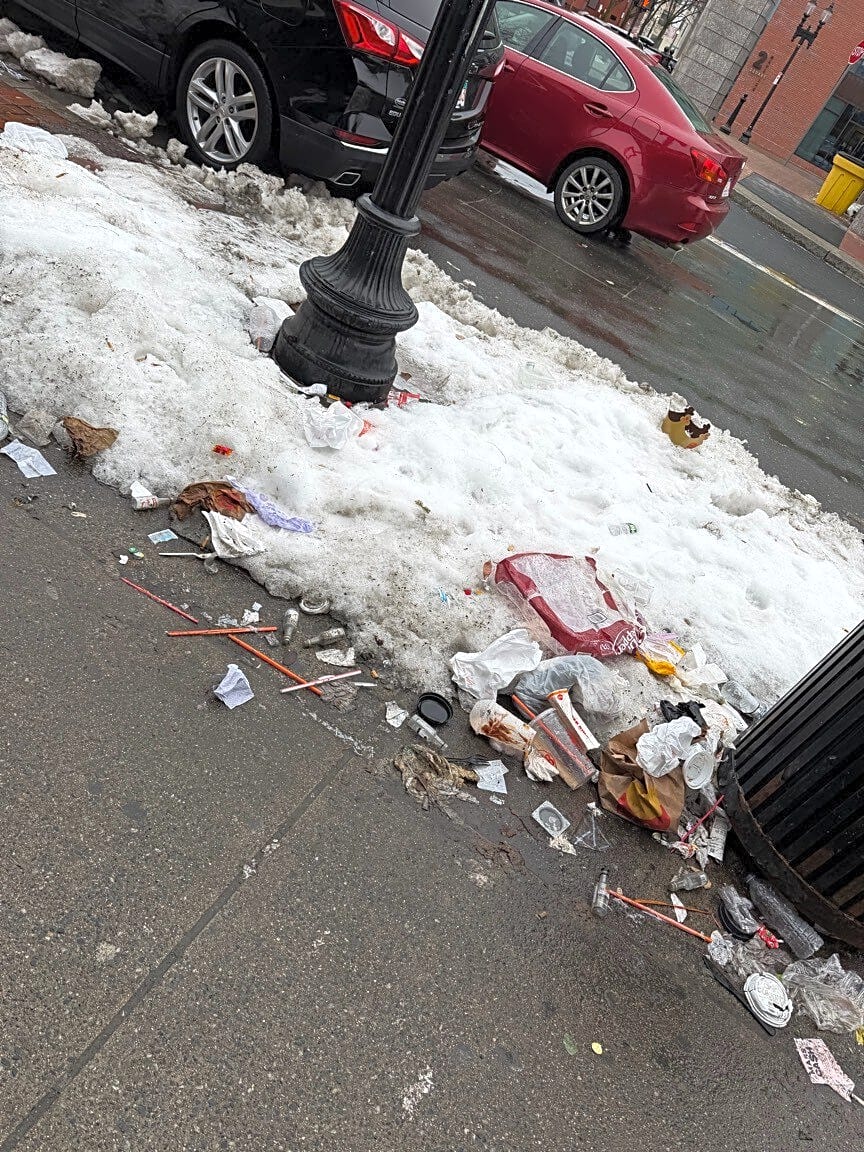 19 Maverick Sq, East Boston, Ma, 02128There is a lot of trash on the sidewalk from Burger King to the Brasil Brasil store.