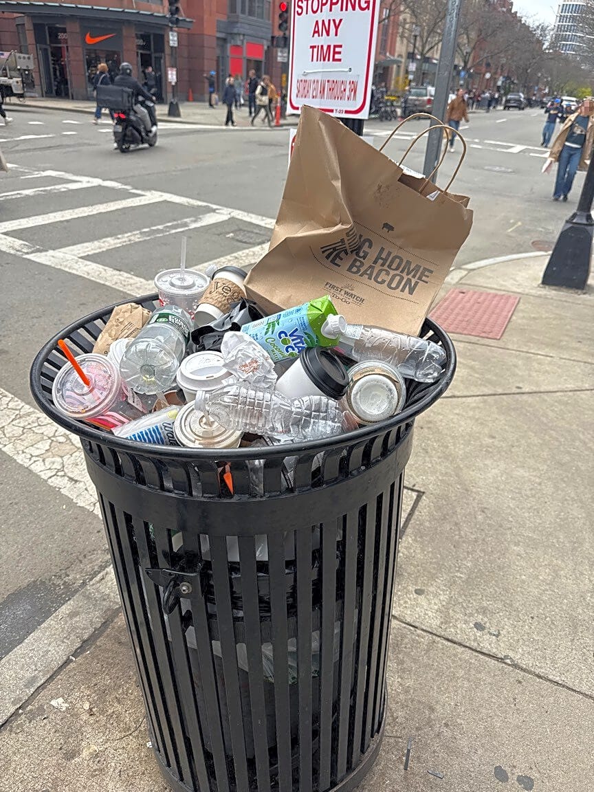 Intersection Of Exeter St And Newbury St, Boston, MaThe Trash cans are full on Newbury st because of the marathon and all the extra visitors Please empty them all. Thank you!!!