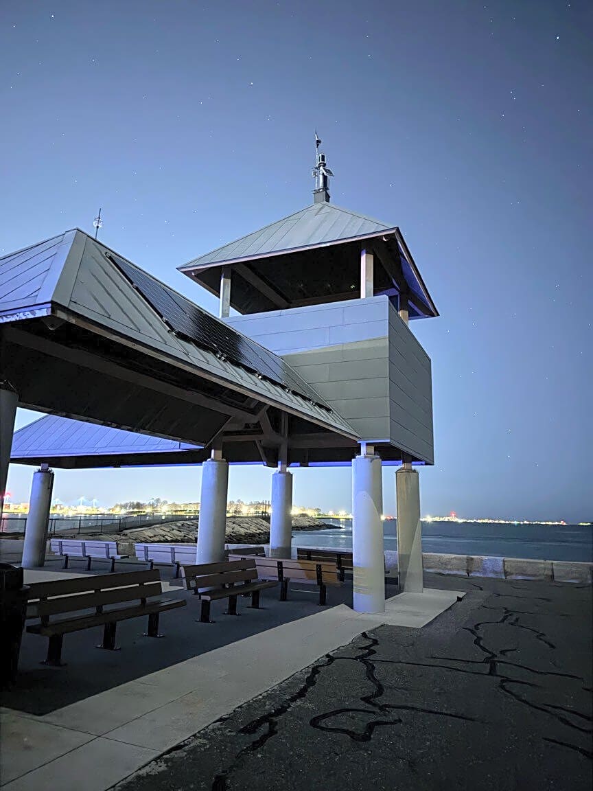 The white maritime beacon on top is flashing extremely dimly. Bulb is going out or circuits are broken.