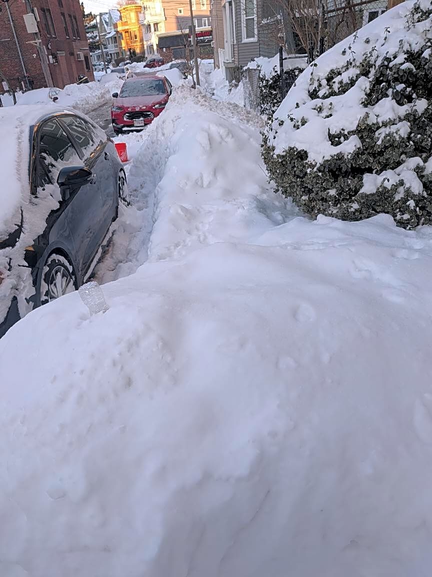 Intersection Of M St And E Fifth St, South Boston, MaThis is East 4th street in South Boston between L & M doesn’t look like plows have touched our streets since the middle of storm 1 nothing after the few inches added in Monday night and all the handicap corners are completely plowed in M & 5th has about 15 feet high snow banks on each corner almost an accident with Fed Ex truck earlier -
