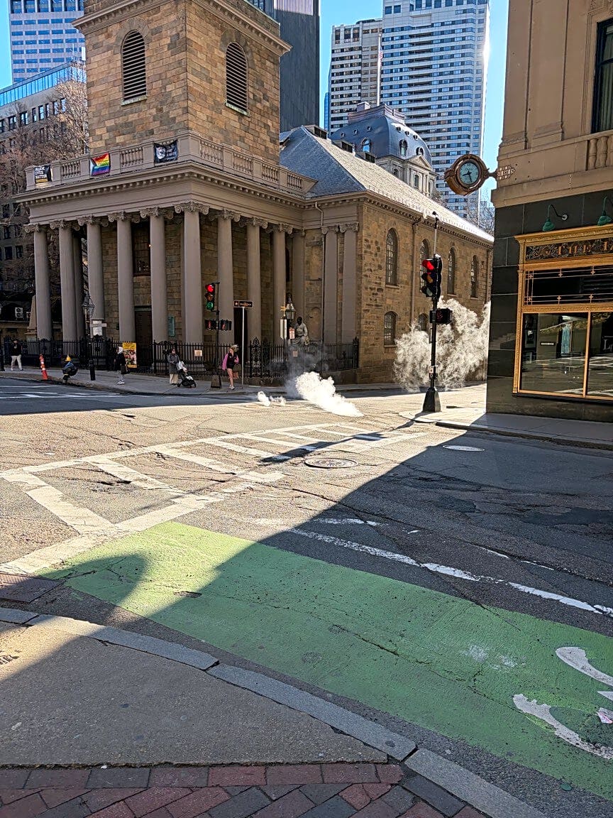 Intersection Of Beacon St And School St And Tremont St, Boston, MaHot steam coming out of the utility hole covers.