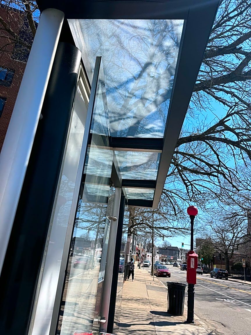 Intersection Of Jamaica St And South St, Jamaica Plain, Mabroken bus stop glass display