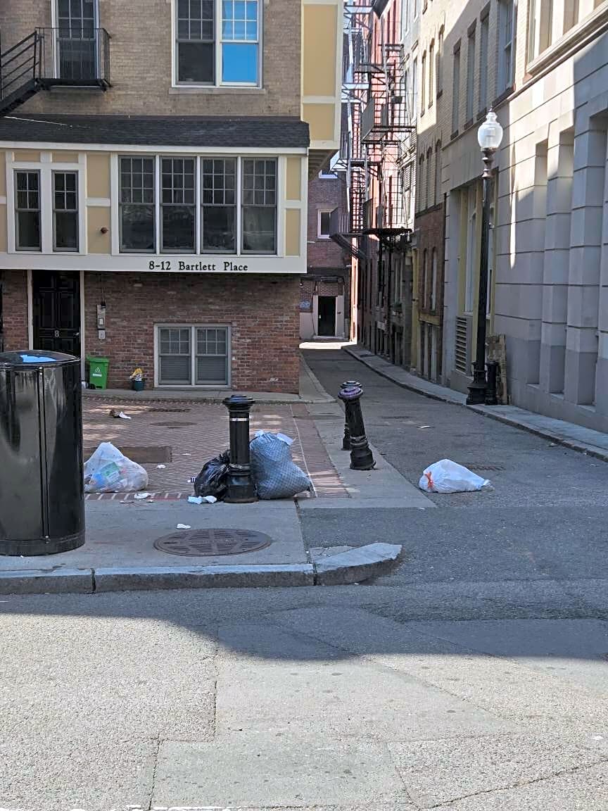 Intersection Of Parmenter St And Bartlett Pl And Salem St, Boston, MaTrash bags left on sidewalk.