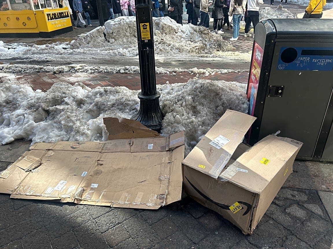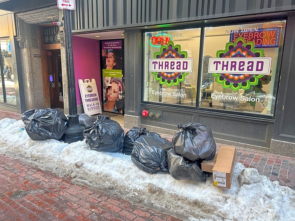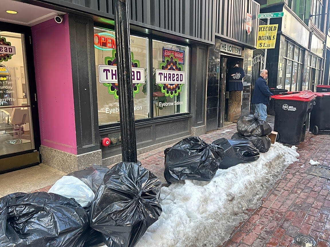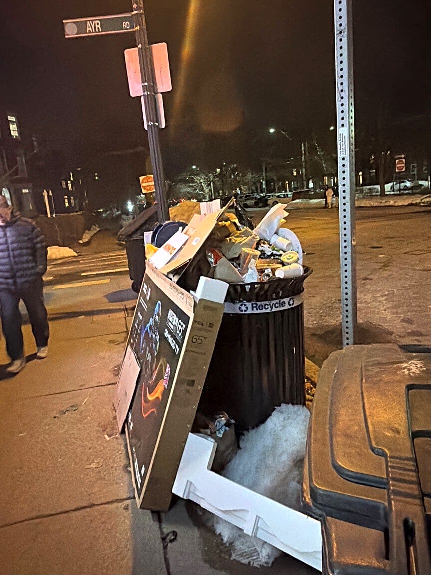 91 A 93 Prince St, Boston, Ma, 02113Large snow pile filled with trash- trash can overflowing blocked sidewalk access . So much trash in snow banks never picked up by trash company