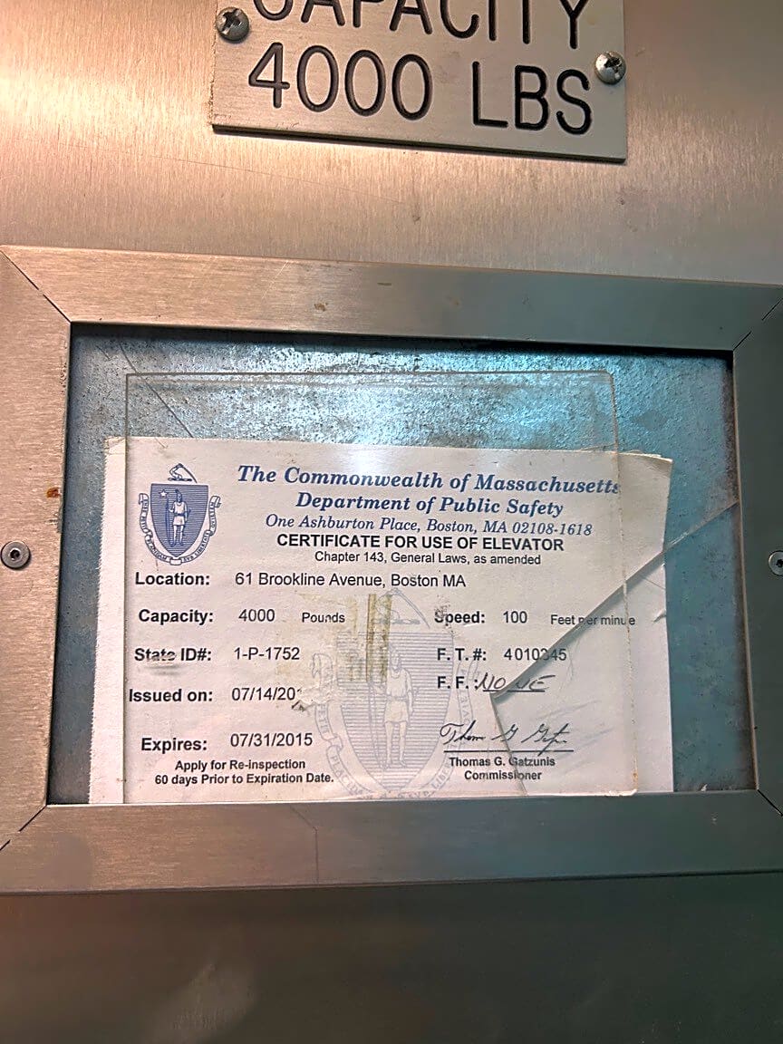 service elevator in 61 Brookline Ave has not been tested in accordance with Massachusetts inspection since 2015. This elevator is very creaky and does not seem to be holding up well. I am unsure if they just have not put up the new certification or have not been in accordance at all.