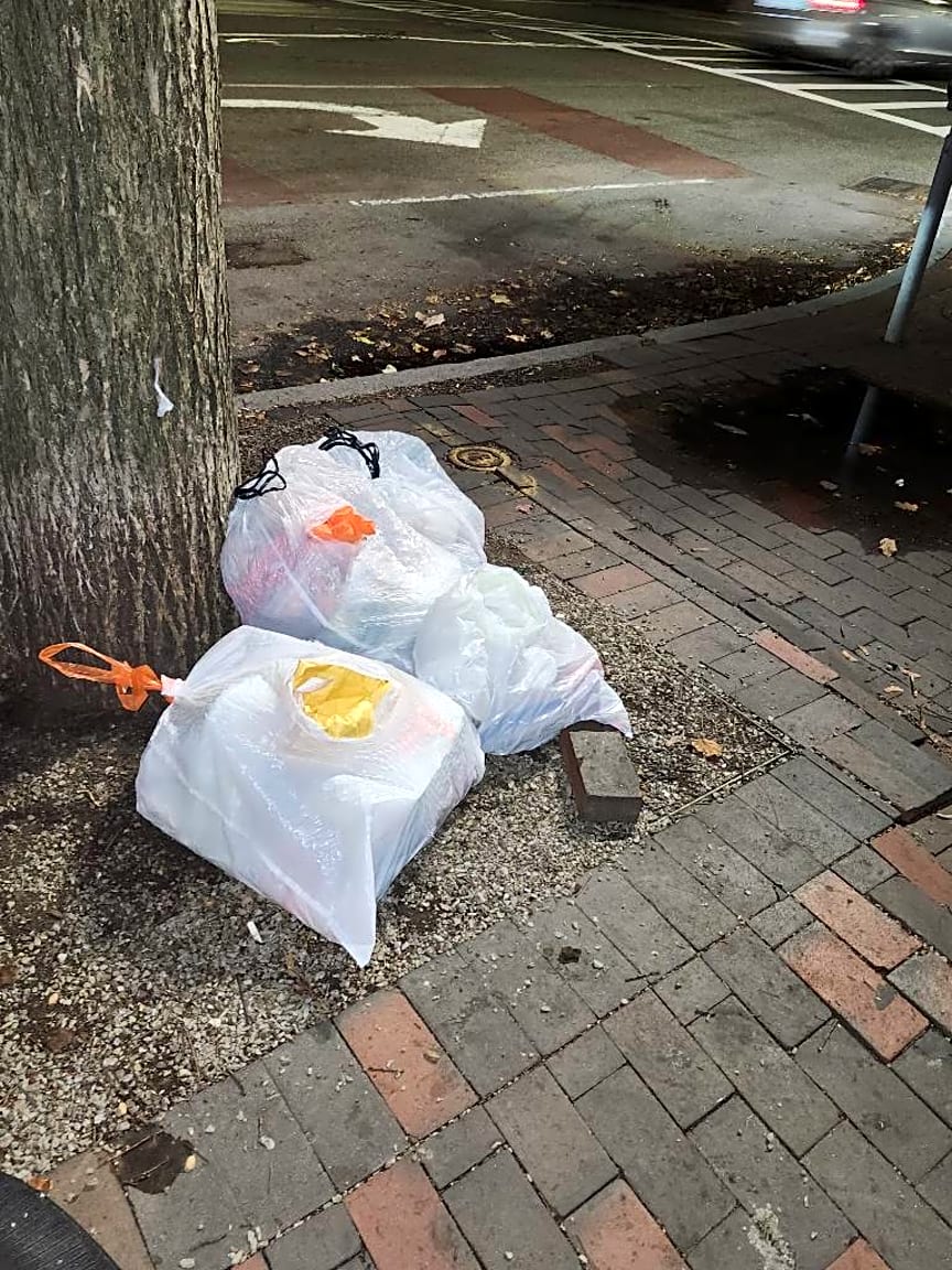 CLOSED #101006374240Noted. Bags found dumped on sidewalk no evidence found unable to issue citation sent to dpw for removal.
